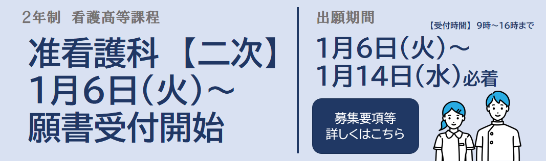 更新情報 全て 入試情報 行事・学校生活 その他 看護科 四次入試が始まります 2026年2月20日 看護科の四次入試は、 2026年3月4日(水)から出願開始です。 出願期間は 2 … 入試情報 准看護科 三次入試が始まります 2026年2月12日 准看護科の二次入試は、 2026年2月16日(火)から出願開始です。 一次入試の … 入試情報 看護科 三次入試が始まります 2026年1月29日 看護科の三次入試は、 2026年2月2日(月)から出願開始です。 出願期間は 2 … 入試情報 看護科 二次入試が始まります 2025年12月18日 看護科の二次入試は、 2026年1月15日(木)から出願開始です。 出願期間は … 入試情報 准看護科 二次入試が始まります 2025年12月11日 准看護科の二次入試は、 2026年1月6日(火)から出願開始です。 一次入試の出 … 入試情報 准看護科 個別の学校案内随時受付中。※本年度の学校説明会は終... 2025年5月31日 准看護科の受験を考えている皆様に向けて、学校説明会を開催します。 学校説明会の詳 … 入試情報 1 2 3 … 9 Next » 看護科 四次入試が始まります 2026年2月20日 看護科の四次入試は、 2026年3月4日(水)から出願開始です。 出願期間は 2 … 入試情報 准看護科 三次入試が始まります 2026年2月12日 准看護科の二次入試は、 2026年2月16日(火)から出願開始です。 一次入試の … 入試情報 看護科 三次入試が始まります 2026年1月29日 看護科の三次入試は、 2026年2月2日(月)から出願開始です。 出願期間は 2 … 入試情報 看護科 二次入試が始まります 2025年12月18日 看護科の二次入試は、 2026年1月15日(木)から出願開始です。 出願期間は … 入試情報 准看護科 二次入試が始まります 2025年12月11日 准看護科の二次入試は、 2026年1月6日(火)から出願開始です。 一次入試の出 … 入試情報 准看護科 個別の学校案内随時受付中。※本年度の学校説明会は終... 2025年5月31日 准看護科の受験を考えている皆様に向けて、学校説明会を開催します。 学校説明会の詳 … 入試情報 1 2 3 … 6 Next » 准看護科:2年生 校外学習(長島愛生園) 2025年5月13日 准看護科2年生が「看護倫理」の学習として岡山県の「国立療養所長島愛生園歴史館」 … 行事・学校生活 2025年度入学許可書授与式 2025年4月4日 2025年度入学許可書授与式が4月4日に行われ、准看護科59期生・看護科47期生 … 行事・学校生活 2024年度 卒業式を行いました 2025年3月8日 3月7日、卒業式が行われ、准看護科57期生・看護科44期生の皆さんが、大精協看護 … 行事・学校生活 【看護科】看護師国家試験への応援メッセージ 2025年2月3日 准看護科に引き続き、2月16日(日)には看護師国家試験が実施されます。 自身のこ … 行事・学校生活 【准看護科】准看護師資格試験への応援メッセージ 2025年1月31日 いよいよ、2月2日は令和6年度の准看護師資格試験の試験日です。 体調管理に気をつ … 行事・学校生活 2024年度 災害看護(防災訓練) 2024年12月20日 12月20日、災害看護(防災訓練)を行いました。 「守ろう・救おう・大切ないのち … 行事・学校生活 1 2 3 Next » 求人情報を公開いたしました 2025年5月13日 看護科 (小児看護学)担当教員(常勤)の求人情報を掲載いたしました。 詳細につき … 未分類 求人情報を公開いたしました 2025年4月25日 臨地実習担当教員(短期)の求人情報を掲載いたしました。 詳細につきましては、本校 … 未分類 求人情報を公開いたしました 2024年5月28日 常勤職員・短期職員の求人情報を掲載いたしました。 詳細につきましては、本校ホーム … 未分類 本校学生の新型コロナウイルス感染について(お知らせ) 2020年12月15日 … 未分類